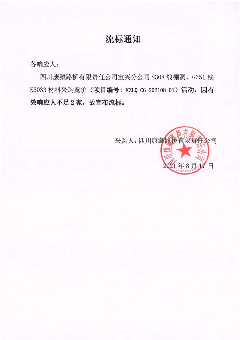 四川康藏路橋有限責(zé)任公司寶興分公司S308線棚洞、G351線K3033材料采購競價流標(biāo)通知