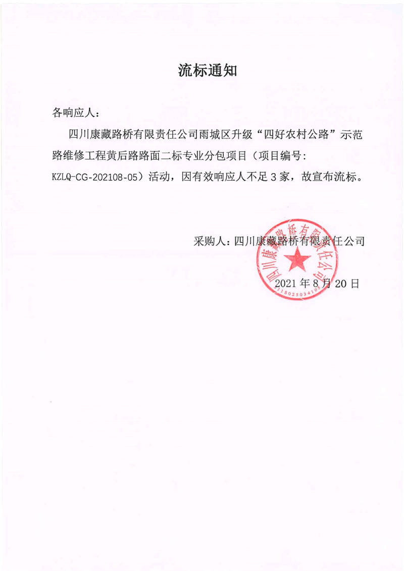 四川康藏路橋有限責(zé)任公司雨城區(qū)升級“四好農(nóng)村公路”示范路維修工程黃后路路面二標(biāo)專業(yè)分包項(xiàng)目流標(biāo)通知