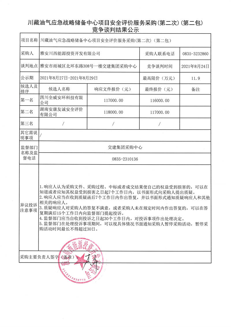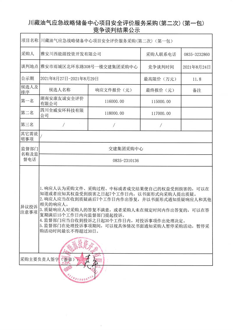 川藏油氣應急戰(zhàn)略儲備中心項目安全評價服務(wù)采購(第二次)(第一包、第二包)競爭談判結(jié)果公示
