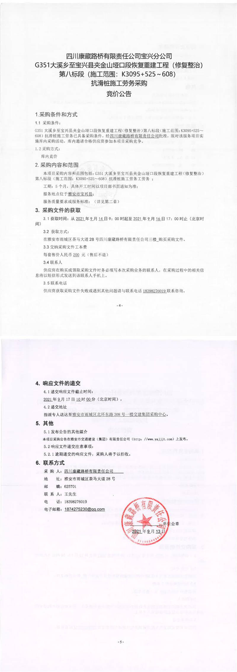 四川康藏路橋有限責(zé)任公司寶興分公司G351大溪鄉(xiāng)至寶興縣夾金山埡口段恢復(fù)重建工程(修復(fù)整治)第八標段(施工范圍:K3095+525-608)抗滑樁施工勞務(wù)采購競價公告