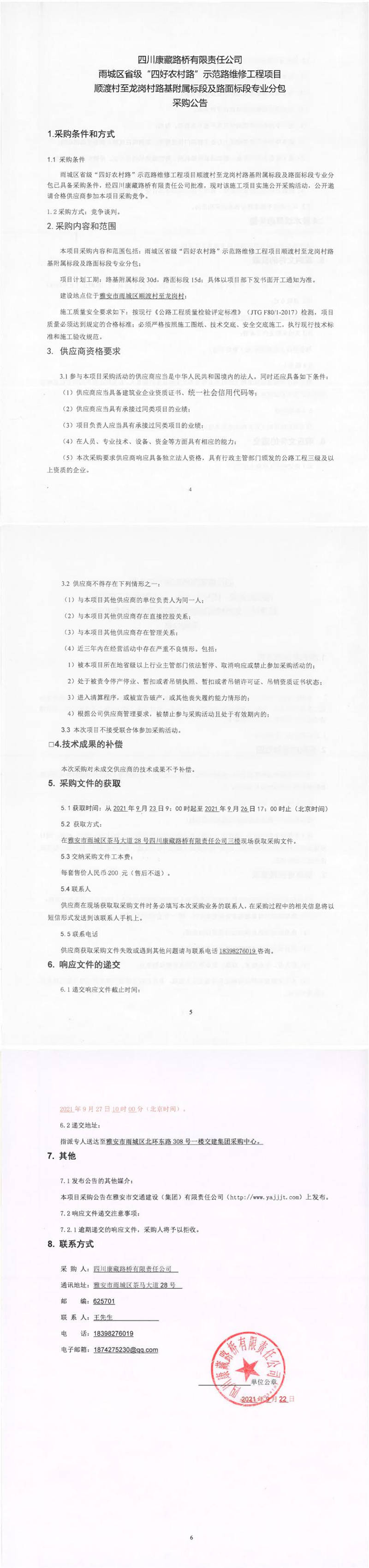 四川康藏路橋有限責(zé)任公司雨城區(qū)省級“四好農(nóng)村路”示范路維修工程項目順渡村至龍崗村路基附屬標(biāo)段及路面標(biāo)段專業(yè)分包采購公告