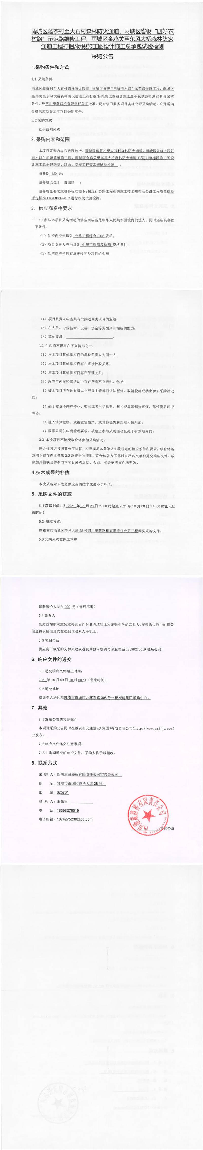 四川康藏路橋有限責任公司雨城區(qū)藏茶村至大石村森林防火通道、雨城區(qū)省級“四好農(nóng)村路”示范路維修工程、雨城區(qū)金雞關(guān)至東風大橋森林防火通道工程打捆/標段施工圖設(shè)計施工總承包試驗檢測采購公告