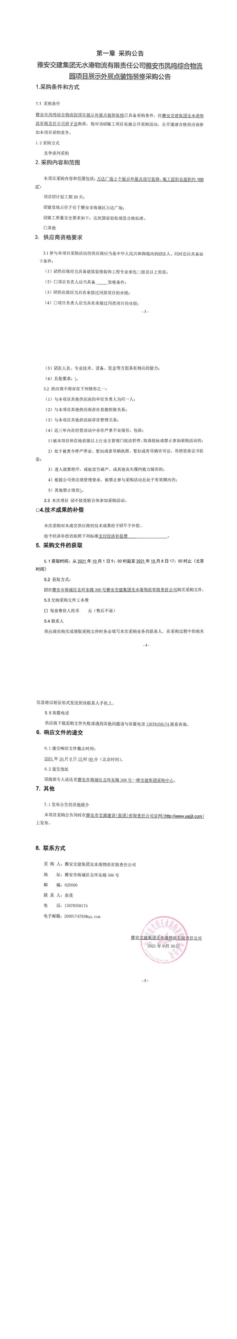 雅安交建集團無水港物流有限責(zé)任公司雅安市鳳鳴綜合物流園項目展示外展點裝飾裝修采購公告