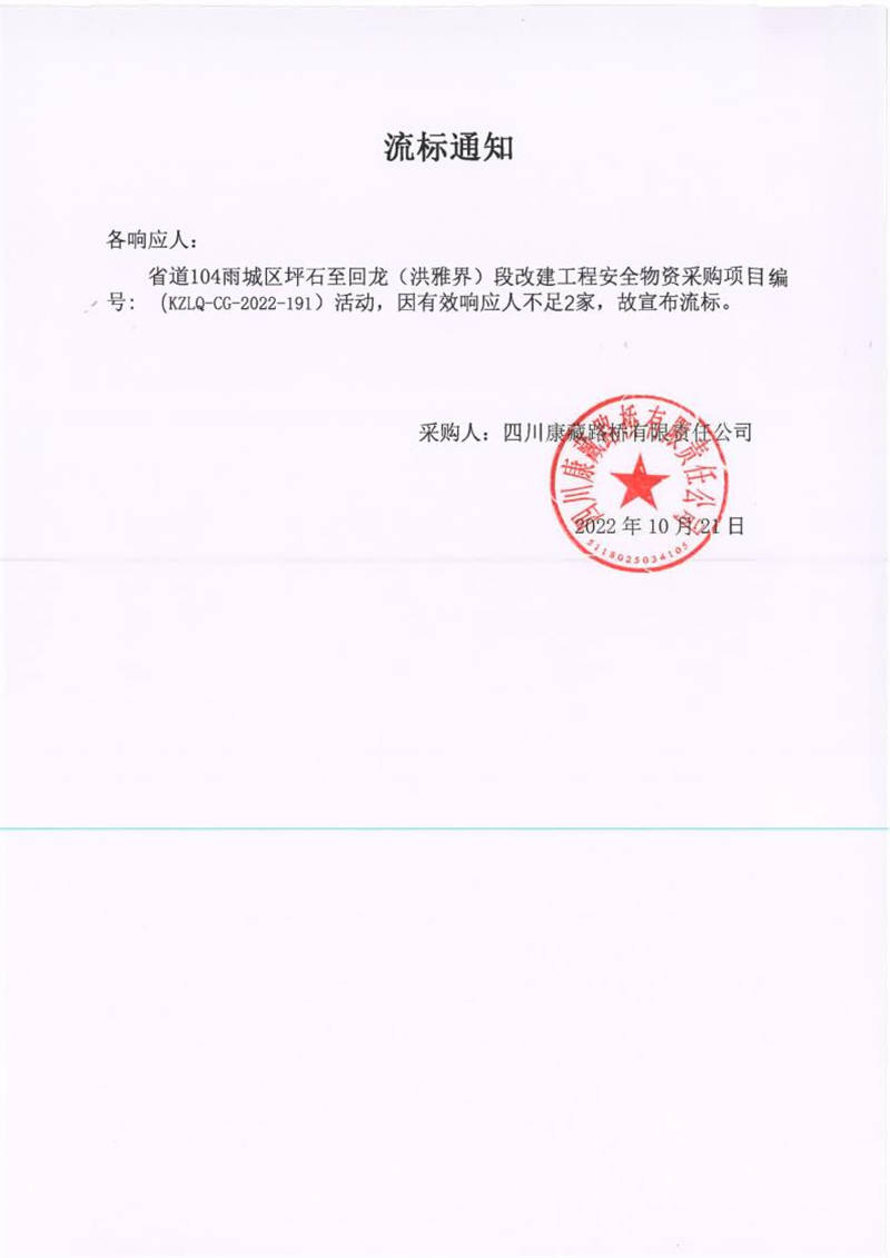 四川康藏路橋有限責任公司省道104雨城區(qū)坪石至回龍(洪雅界)段改建工程項目安全物資采購項目流標通知