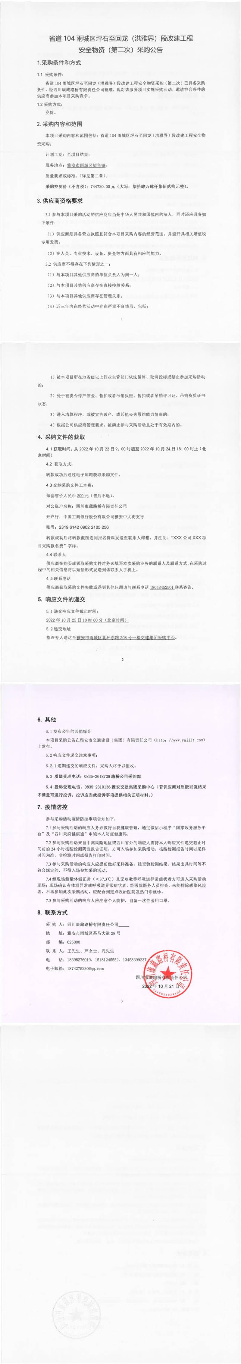 四川康藏路橋有限責任公司省道104雨城區(qū)坪石至回龍(洪雅界)段改建工程安全物資(第二次)采購公告