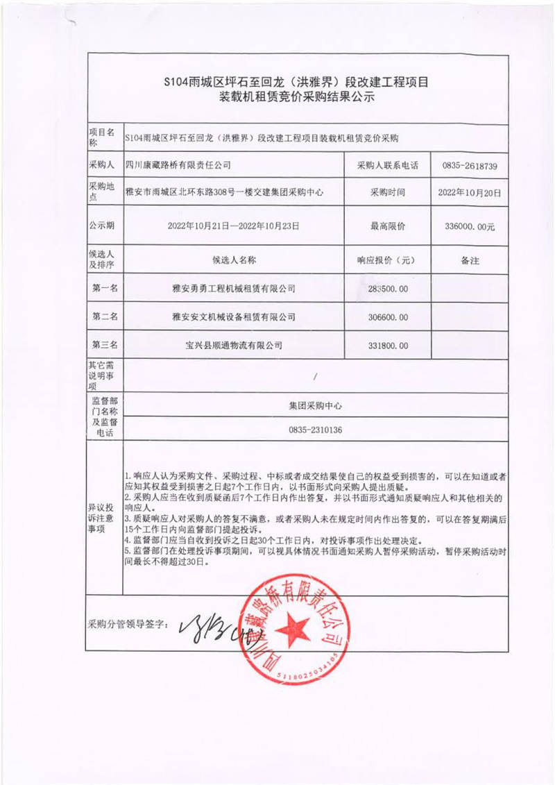 四川康藏路橋有限責任公司S104雨城區(qū)坪石至回龍(洪雅界)段改建工程項目裝載機租賃競價采購結(jié)果公示