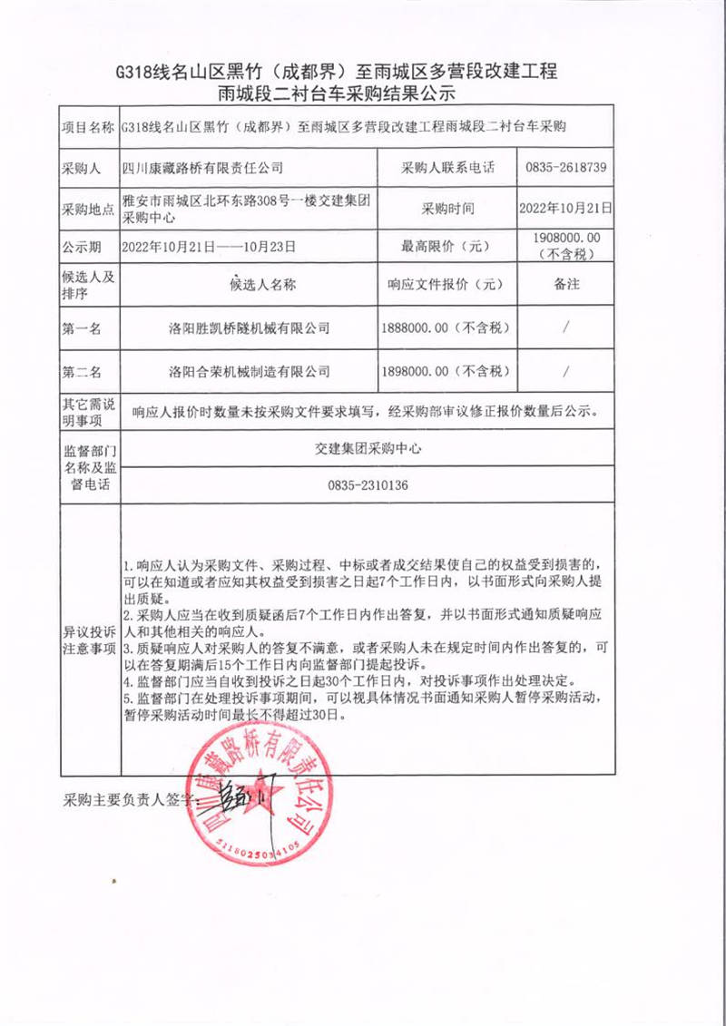 四川康藏路橋有限責(zé)任公司G318線名山區(qū)黑竹(成都界)至雨城區(qū)多營段改建工程雨城段二襯臺車采購結(jié)果公示