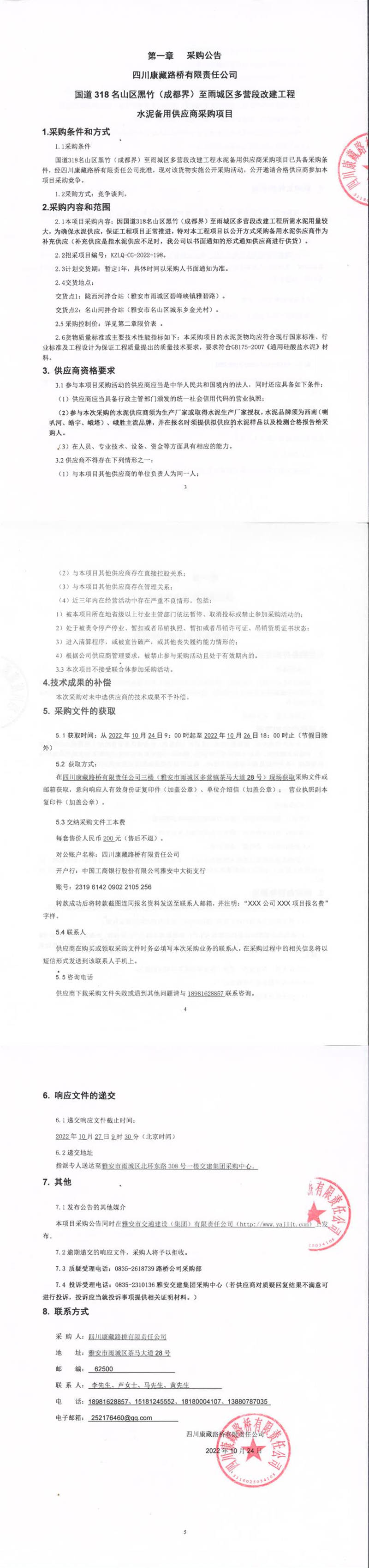 四川康藏路橋有限責(zé)任公司國道318名山區(qū)黑竹(成都界)至雨城區(qū)多營段改建工程水泥備用供應(yīng)商采購項目補(bǔ)遺書(一)