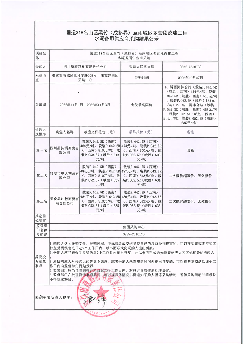 四川康藏路橋有限責任公司國道318名山區(qū)黑竹(成都界)至雨城區(qū)多營段改建工程水泥備用供應(yīng)商采購結(jié)果公示