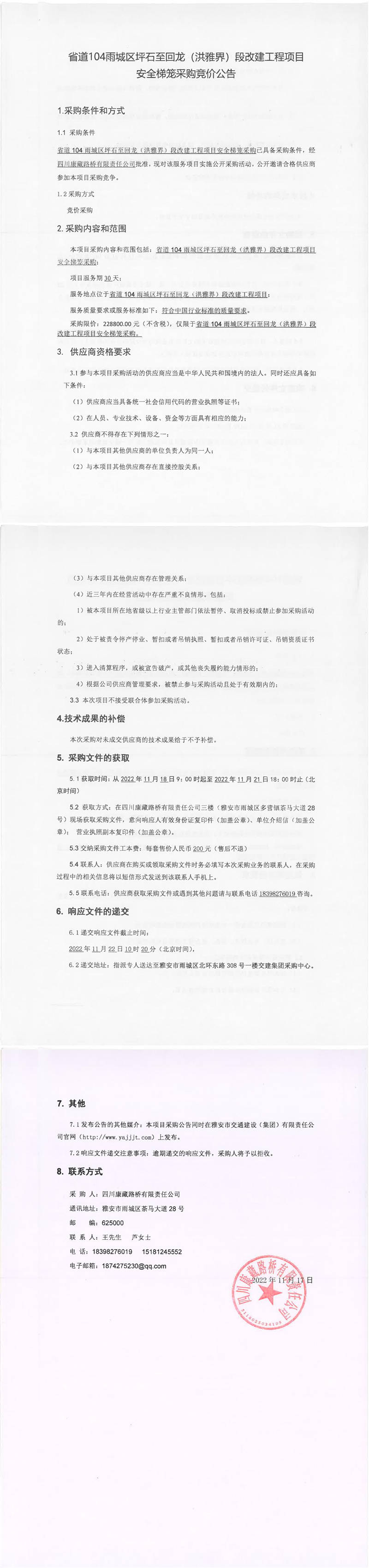 四川康藏路橋有限責任公司省道104雨城區(qū)坪石至回龍(洪雅界)段改建工程項目安全梯籠采購競價公告
