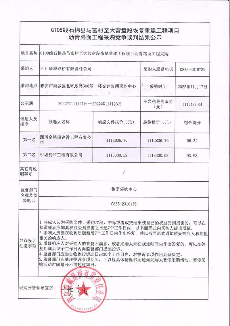 四川康藏路橋有限責(zé)任公司G108線石棉縣馬富村至大營(yíng)盤段恢復(fù)重建工程項(xiàng)目瀝青路面工程采購(gòu)競(jìng)爭(zhēng)談判結(jié)果公示
