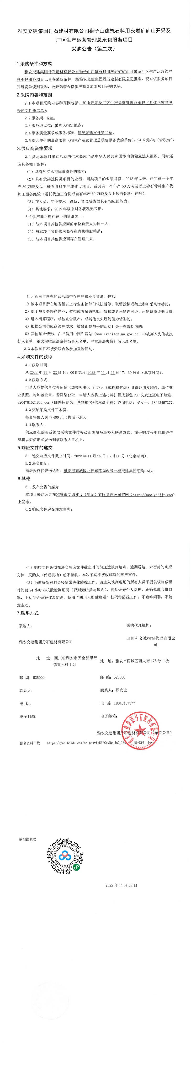 雅安交建集團(tuán)丹石建材有限公司獅子山建筑石料用灰?guī)r礦礦山開采及廠區(qū)生產(chǎn)運(yùn)營管理總承包服務(wù)項(xiàng)目采購公告(第二次)