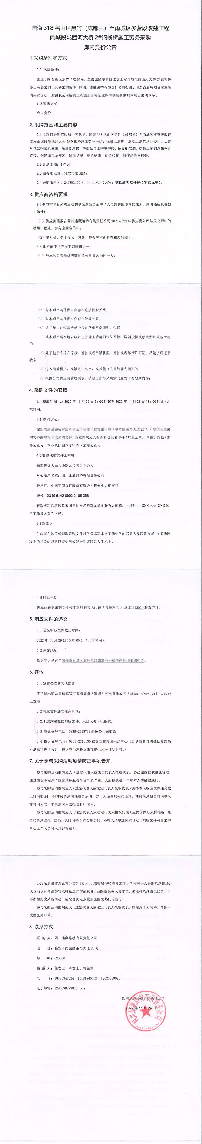 四川康藏路橋有限責(zé)任公司國(guó)道318名山區(qū)黑竹(成都界)至雨城區(qū)多營(yíng)段改建工程雨城段隴西河大橋2#鋼棧橋施工勞務(wù)采購(gòu)庫內(nèi)競(jìng)價(jià)公告