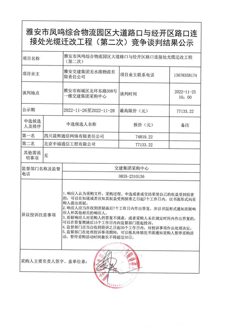 雅安交建集團(tuán)無(wú)水港物流有限責(zé)任公司雅安市鳳鳴綜合物流園區(qū)大道路口與經(jīng)開(kāi)區(qū)路口連接處光纜遷改工程(第二次)競(jìng)爭(zhēng)談判結(jié)果公示