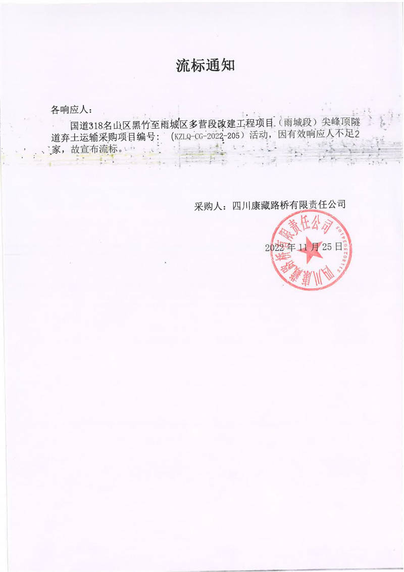 四川康藏路橋有限責任公司國道318名山區(qū)黑竹至雨城區(qū)多營段改建工程項目(雨城段)尖峰頂隧道棄土運輸采購項目流標通知