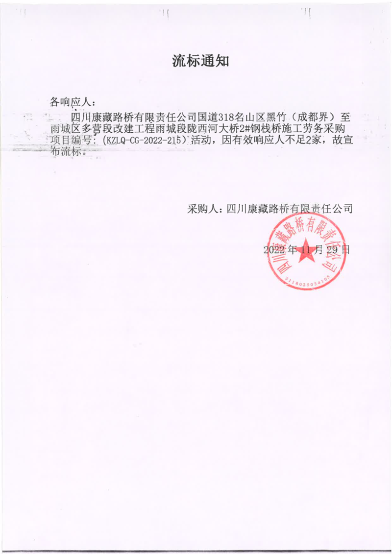 四川康藏路橋有限責任公司國道318名山區(qū)黑竹(成都界)至雨城區(qū)多營段改建工程雨城段隴西河大橋2#鋼棧橋施工勞務(wù)采購流標通知