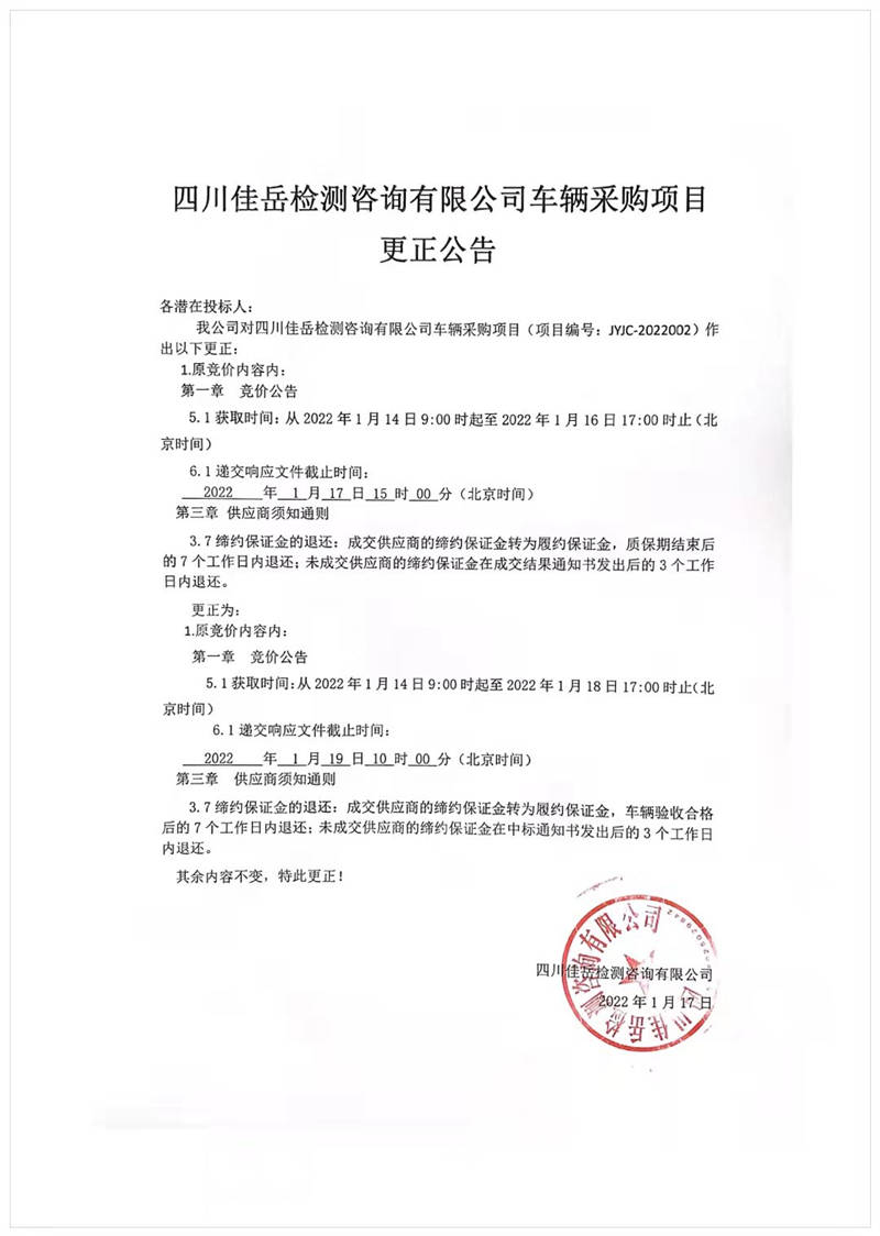 四川佳岳檢測(cè)咨詢(xún)有限公司車(chē)輛采購(gòu)項(xiàng)目更正公告