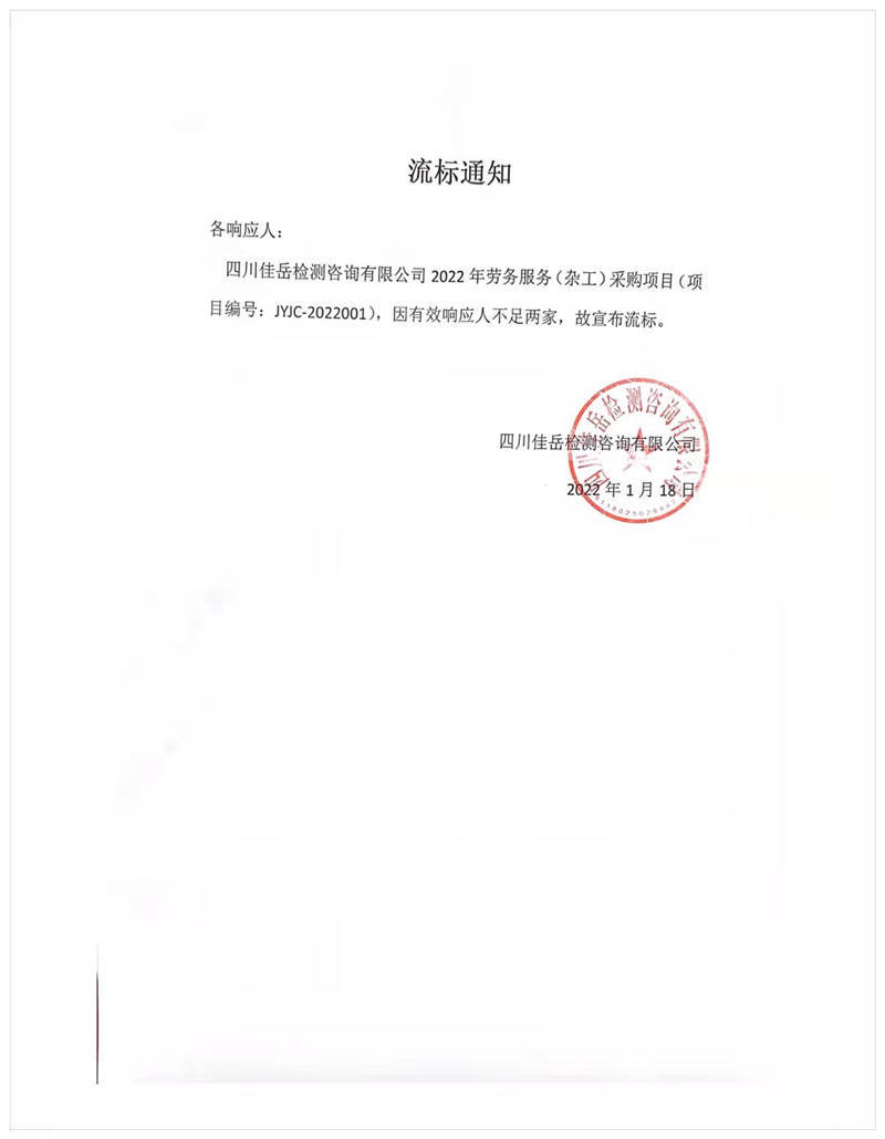 四川佳岳檢測(cè)咨詢有限公司2022年勞務(wù)服務(wù)(雜工)采購(gòu)項(xiàng)目流標(biāo)通知