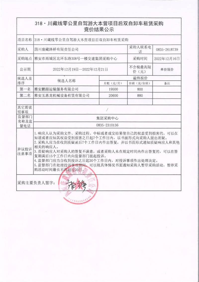 四川康藏路橋有限責(zé)任公司318·川藏線零公里自駕游大本營項目后雙自卸車租賃采購競價結(jié)果公示