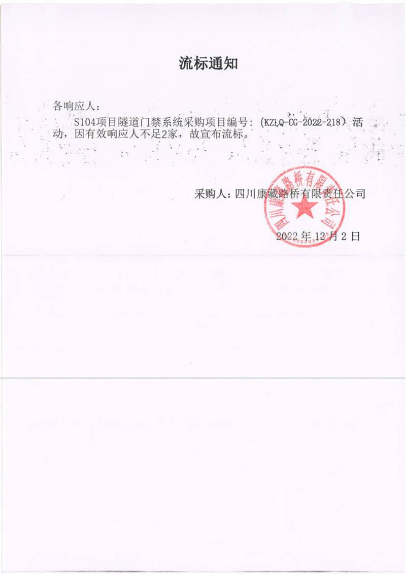 四川康藏路橋有限責任公司S104項目隧道門禁系統(tǒng)流標通知