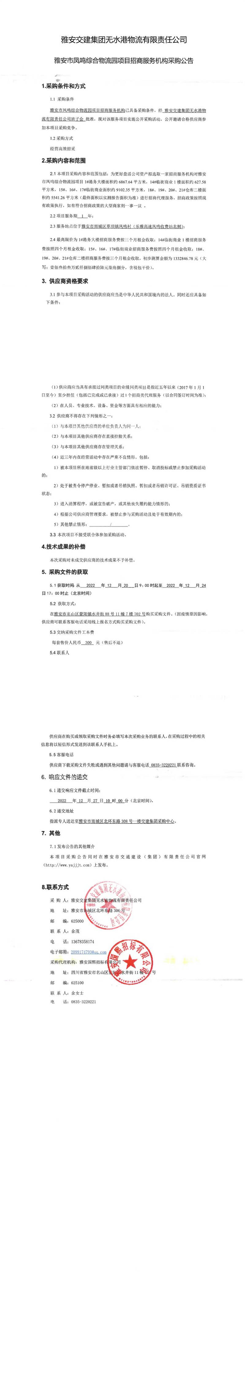 雅安交建集團(tuán)無水港物流有限責(zé)任公司雅安市鳳鳴綜合物流園項(xiàng)目招商服務(wù)機(jī)構(gòu)采購公告