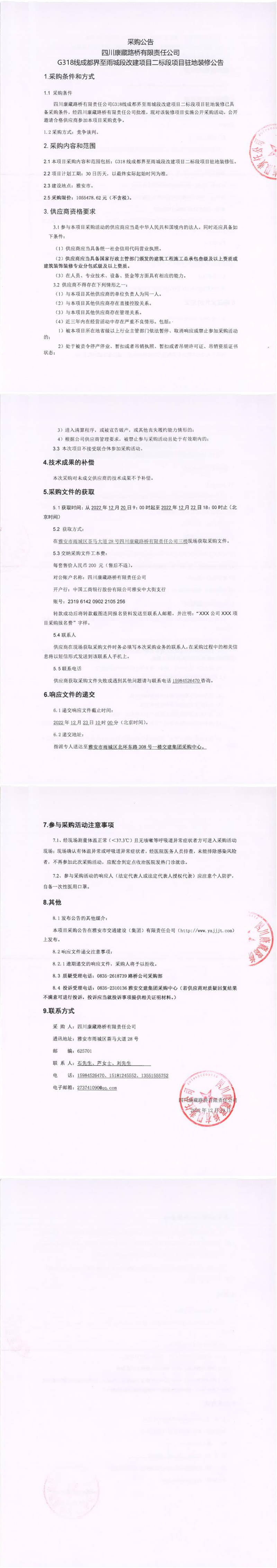 四川康藏路橋有限責(zé)任公司G318線(xiàn)成都界至雨城段改建項(xiàng)目二標(biāo)段項(xiàng)目駐地裝修采購(gòu)公告