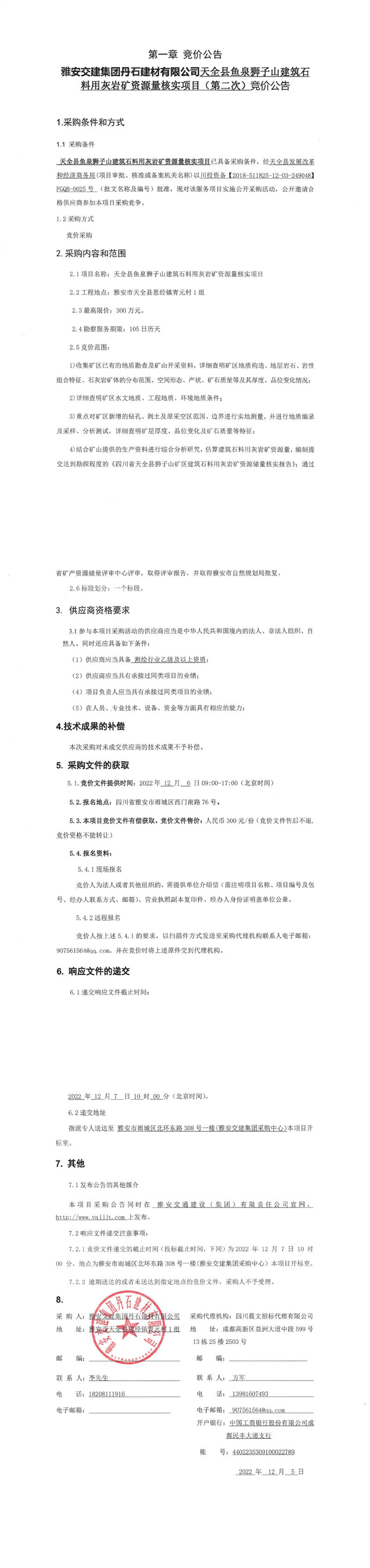 雅安交建集團(tuán)丹石建材有限公司天全縣魚泉獅子山建筑石料用灰?guī)r礦資源量核實項目(第二次)競價公告