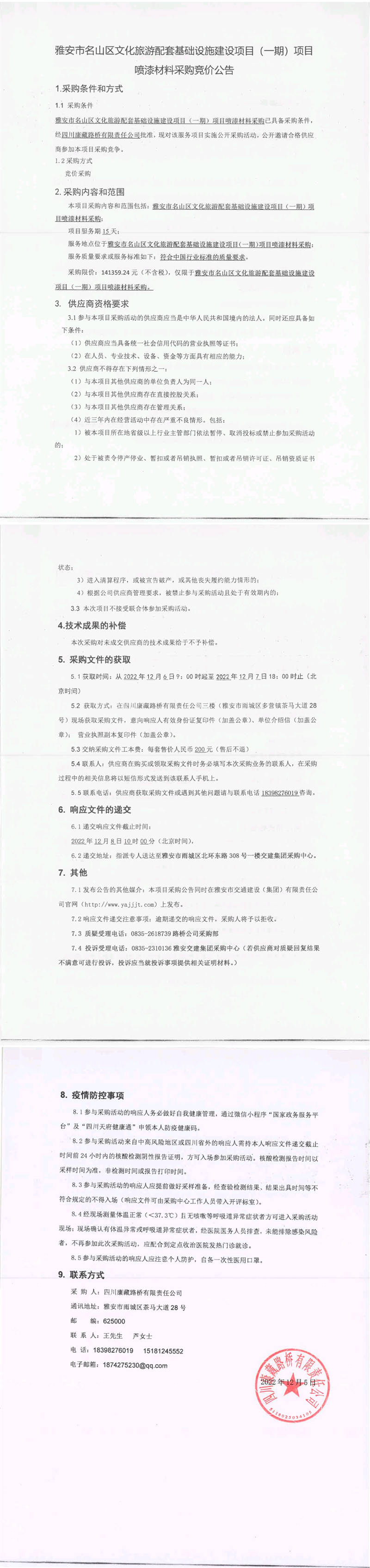 四川康藏路橋有限責(zé)任公司雅安市名山區(qū)文化旅游配套基礎(chǔ)設(shè)施建設(shè)項(xiàng)目(一期)項(xiàng)目噴漆材料采購競價公告