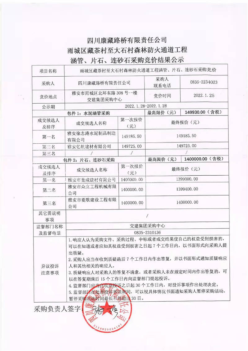 四川康藏路橋有限責(zé)任公司雨城區(qū)藏茶村至大石村森林防火通道工程涵管、片石、連砂石采購競(jìng)價(jià)結(jié)果公示