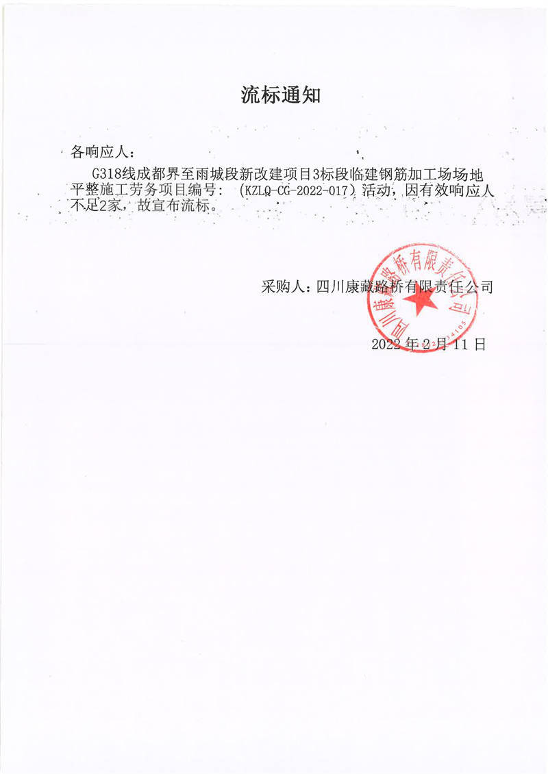 四川康藏路橋有限責(zé)任公司G318線成都界至雨城段新改建項(xiàng)目3標(biāo)段臨建鋼筋加工場(chǎng)場(chǎng)地平整施工勞務(wù)項(xiàng)目流標(biāo)通知
