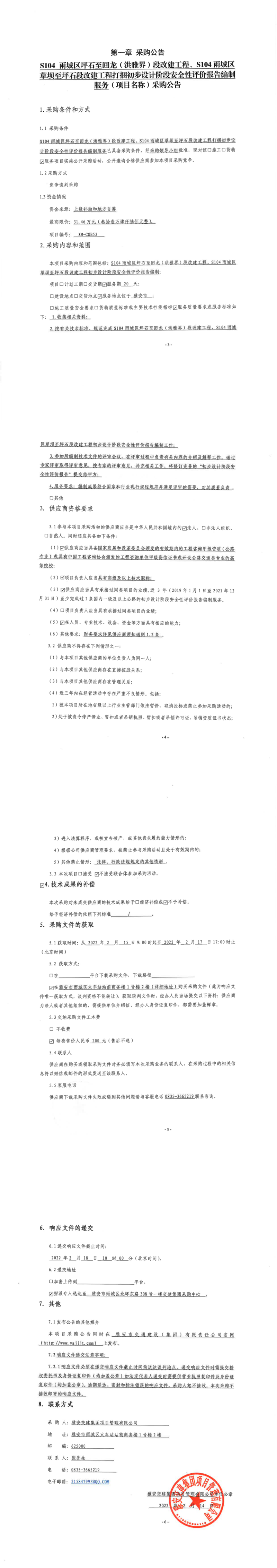 雅安交建集團(tuán)項目管理有限公司S104雨城區(qū)坪石至回龍(洪雅界)段改建工程、S104雨城區(qū)草壩至坪石段改建工程打捆初步設(shè)計階段安全性評價報告編制服務(wù)采購公告