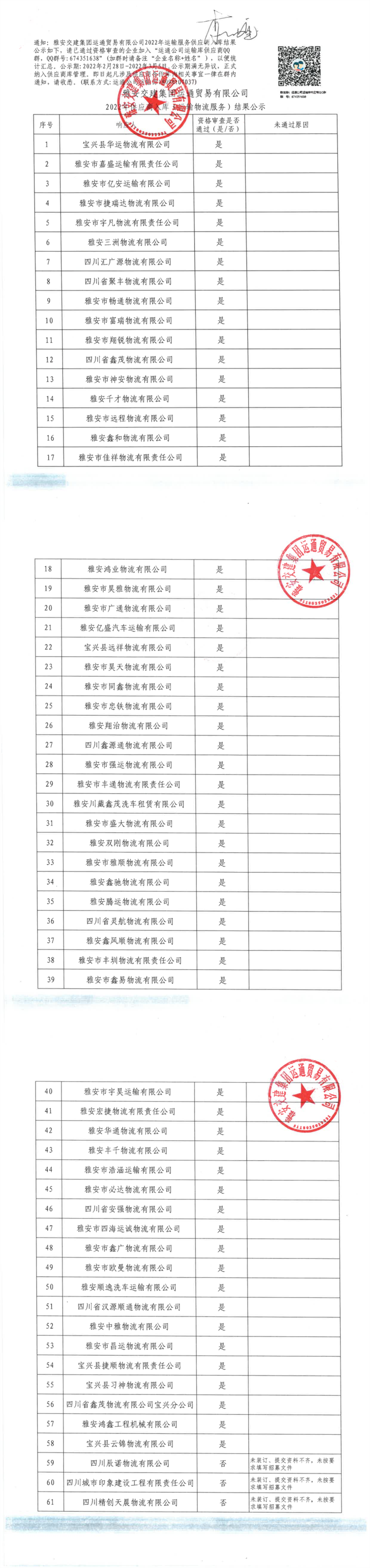 雅安交建集團(tuán)運(yùn)通貿(mào)易有限公司2022年供應(yīng)商入庫(運(yùn)輸物流服務(wù))結(jié)果公示