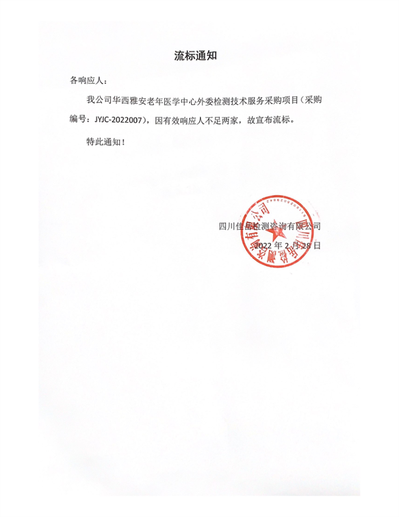 四川佳岳檢測(cè)咨詢(xún)有限公司華西雅安老年醫(yī)學(xué)中心外委檢測(cè)技術(shù)服務(wù)采購(gòu)項(xiàng)目流標(biāo)通知