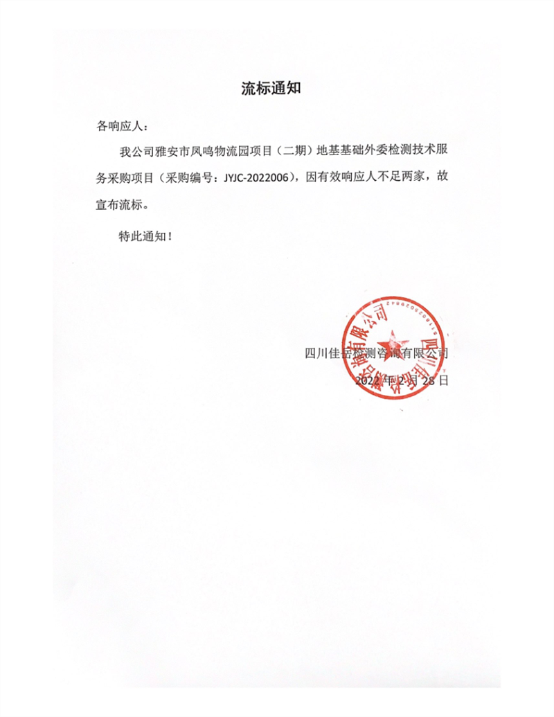 四川佳岳檢測咨詢有限公司雅安市鳳鳴物流園項目(二期)地基基礎(chǔ)外委檢測技術(shù)服務(wù)采購項目流標(biāo)通知