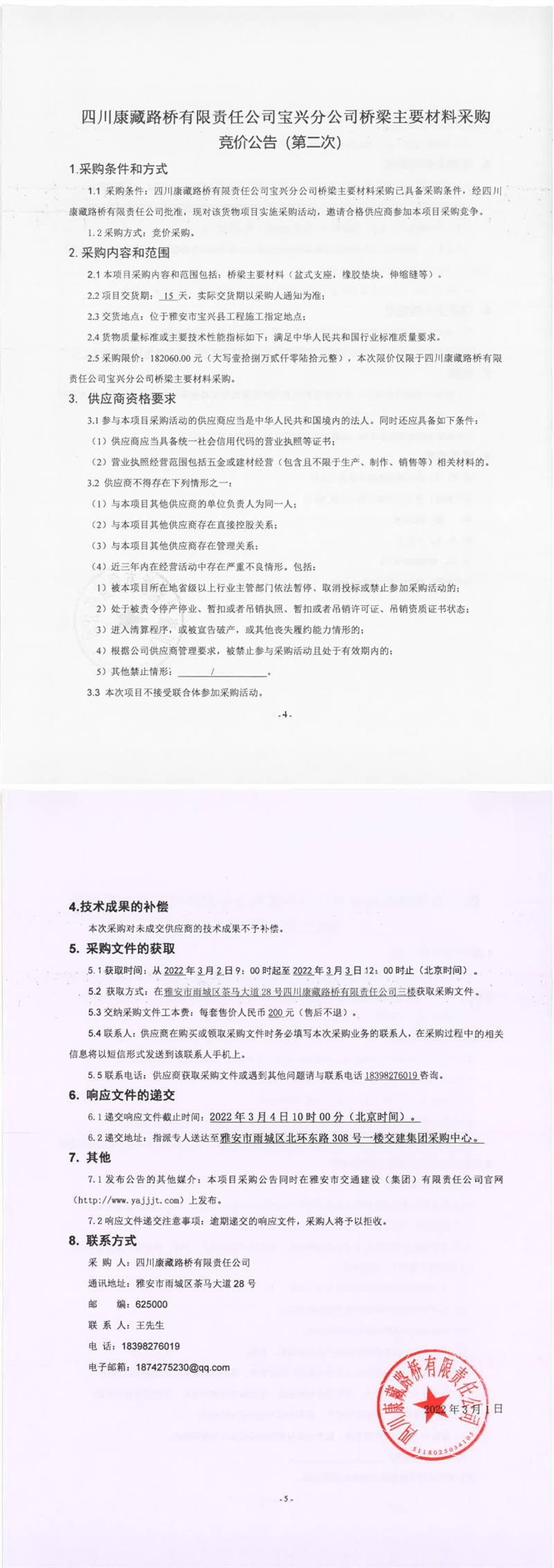 四川康藏路橋有限責(zé)任公司寶興分公司橋梁主要材料采購競價(jià)公告(第二次)