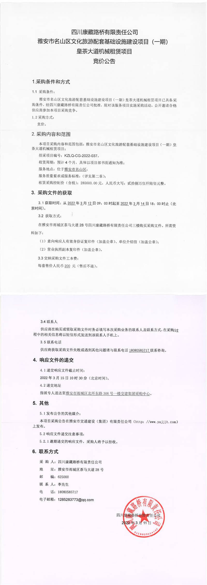 四川康藏路橋有限責(zé)任公司雅安市名山區(qū)文化旅游配套基礎(chǔ)設(shè)施建設(shè)項目(一期)皇茶大道機械租賃項目競價公告