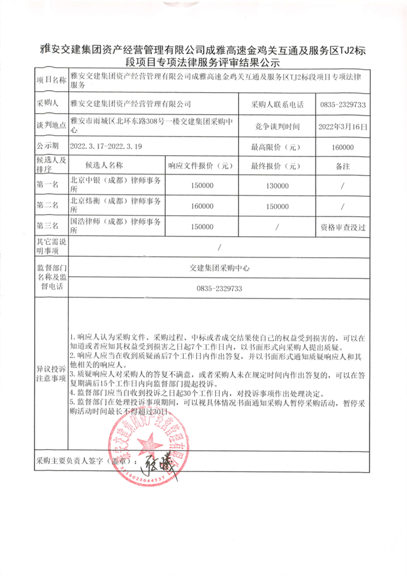 雅安交建集團(tuán)資產(chǎn)經(jīng)營(yíng)管理有限公司成雅高速金雞關(guān)互通及服務(wù)區(qū)TJ2標(biāo)段項(xiàng)目專項(xiàng)法律服務(wù)評(píng)審結(jié)果公示