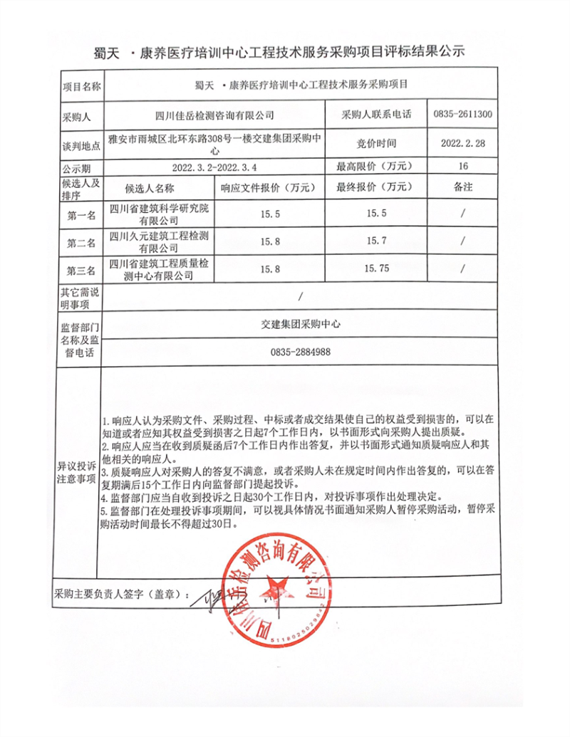 四川佳岳檢測咨詢有限公司蜀天.康養(yǎng)醫(yī)療培訓中心工程技術服務采購項目評標結(jié)果公示