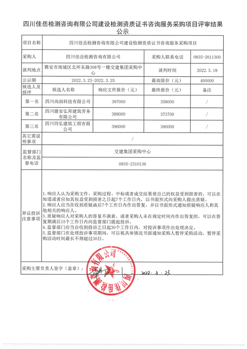 四川佳岳檢測咨詢有限公司建設(shè)檢測資質(zhì)證書咨詢服務(wù)采購項(xiàng)目評審結(jié)果公示