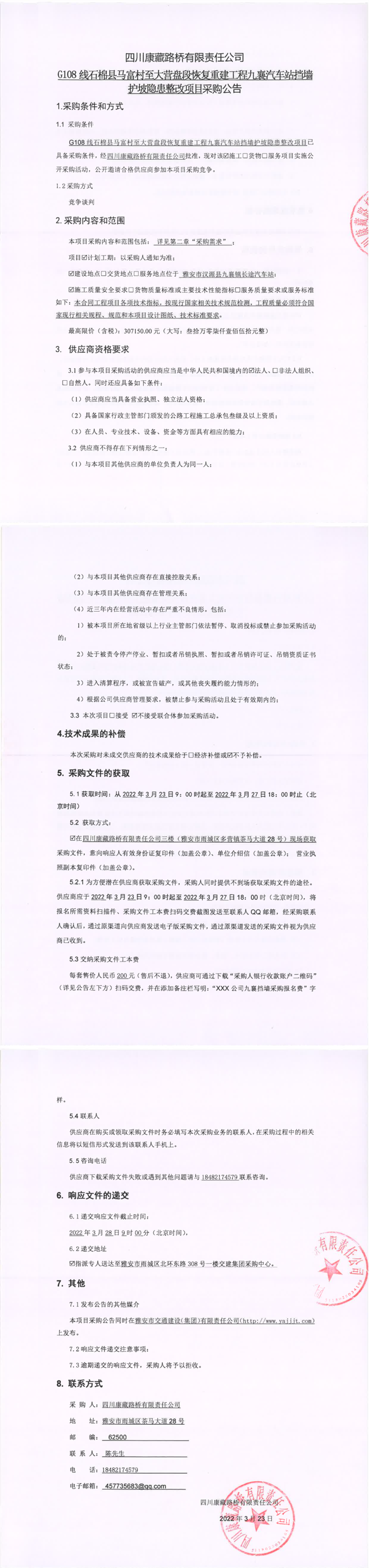 四川康藏路橋有限責(zé)任公司G108線石棉縣馬福村至大營(yíng)盤(pán)段恢復(fù)重建工程九襄汽車站擋墻護(hù)坡隱患整改項(xiàng)目采購(gòu)公告