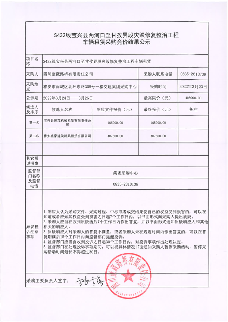 四川康藏路橋有限責任公司S432線寶興縣兩河口至甘孜界段災毀修復整治工程車輛租賃采購競價結果公示
