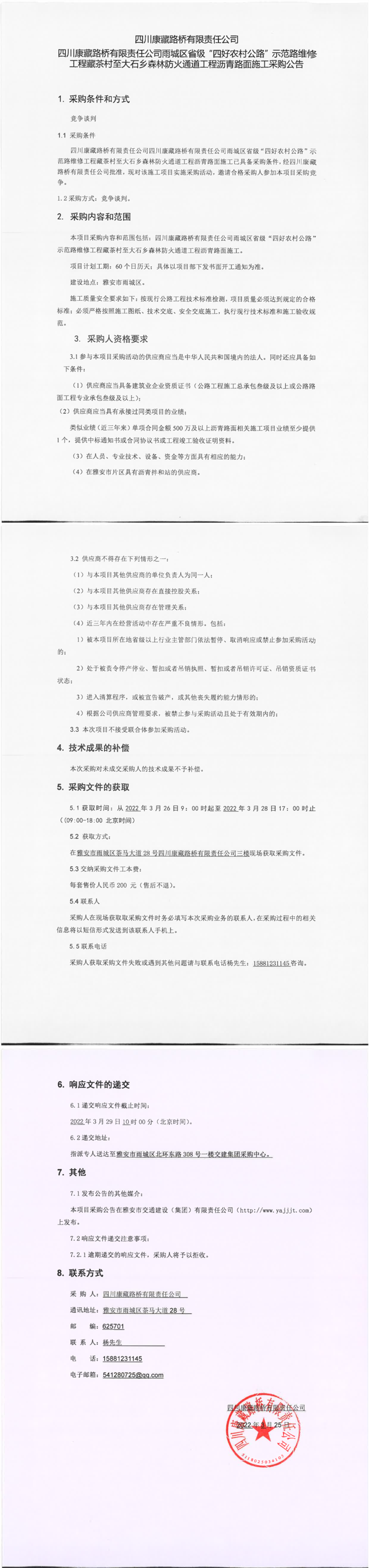 四川康藏路橋有限責(zé)任公司國道318名山區(qū)黑竹(成都界)至雨城區(qū)多營段改建工程雨城籌建段灑水車租賃項目競價公告