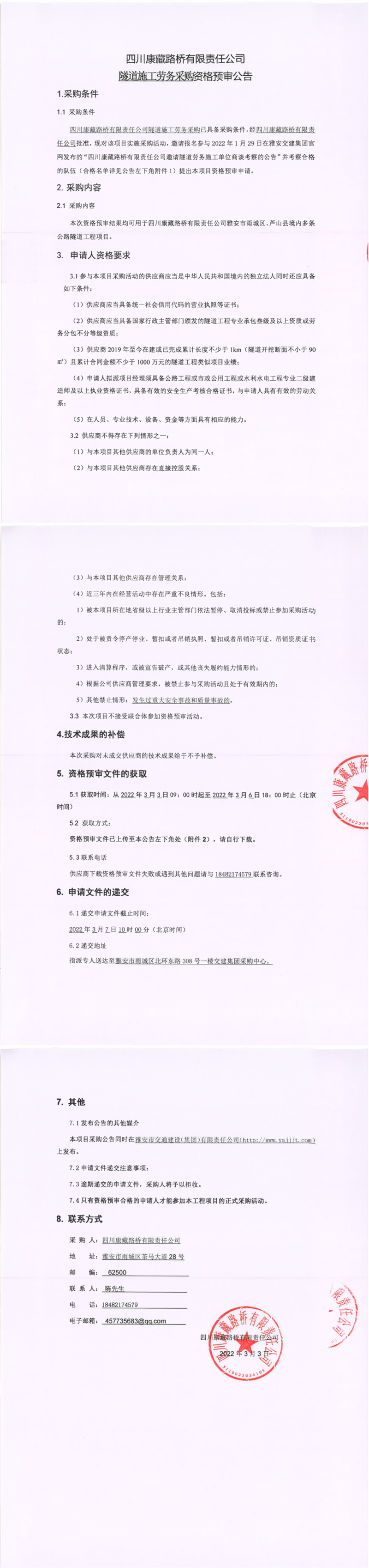 四川康藏路橋有限責任公司隧道施工勞務(wù)采購資格預(yù)審公告