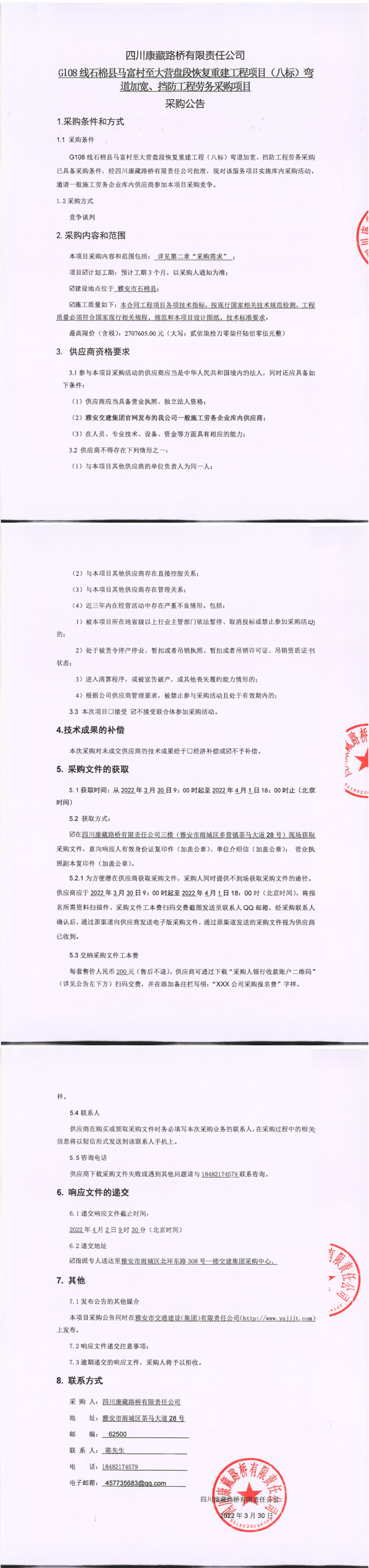 四川康藏路橋有限責(zé)任公司G108線石棉縣馬富村至大營盤段恢復(fù)重建工程(八標(biāo))彎道加寬、擋防工程勞務(wù)采購項目采購公告