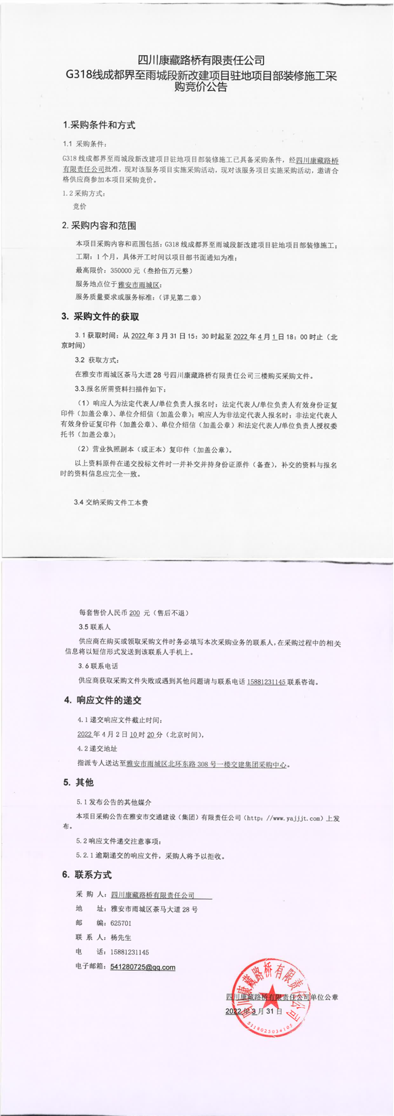四川康藏路橋有限責任公司G318線成都界至雨城段新改建項目駐地項目部裝修施工采購競價公告