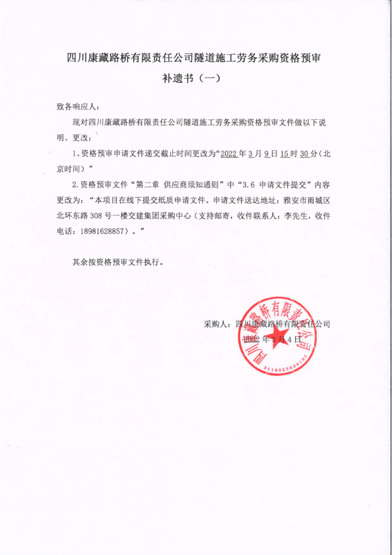 四川康藏路橋有限責(zé)任公司隧道施工勞務(wù)采購資格預(yù)審補(bǔ)遺書(一)