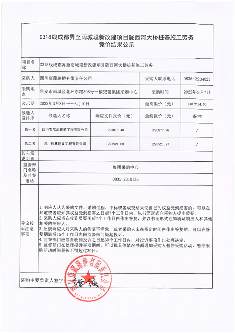 四川康藏路橋有限責任公司G318線成都界至雨城段新改建項目隴西河大橋樁基施工勞務競價結果公示