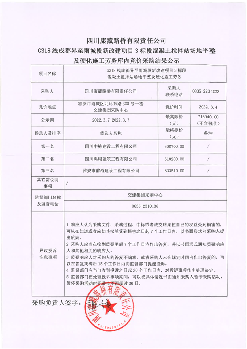 四川康藏路橋有限責(zé)任公司G318線成都界至雨城段新改建項(xiàng)目3標(biāo)段混凝土攪拌站場地平整及硬化施工勞務(wù)庫內(nèi)競價(jià)采購結(jié)果公示