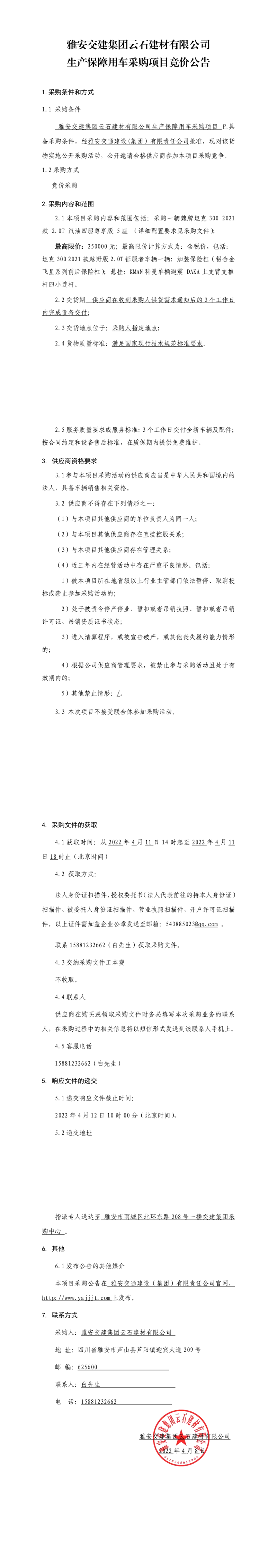 雅安交建集團(tuán)云石建材有限公司生產(chǎn)保障用車采購項(xiàng)目競價公告