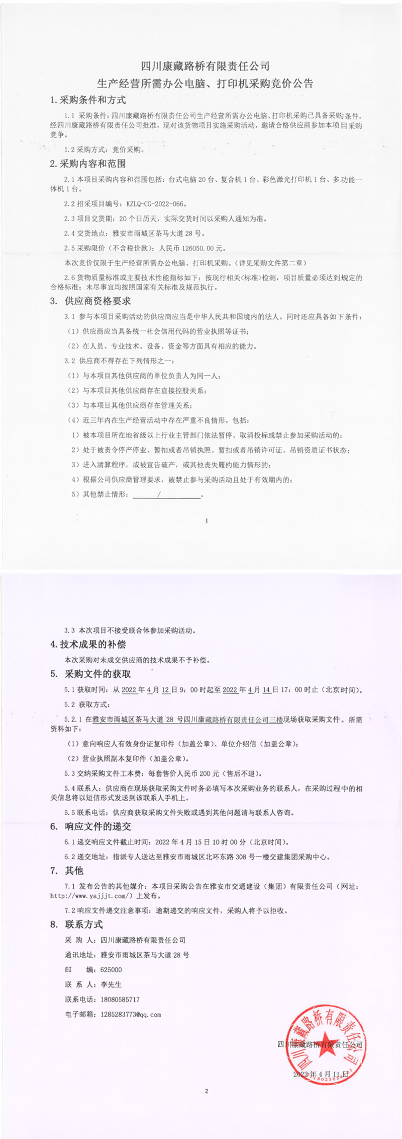 四川康藏路橋有限責(zé)任公司生產(chǎn)經(jīng)營所需辦公電腦、打印機(jī)采購競價公告